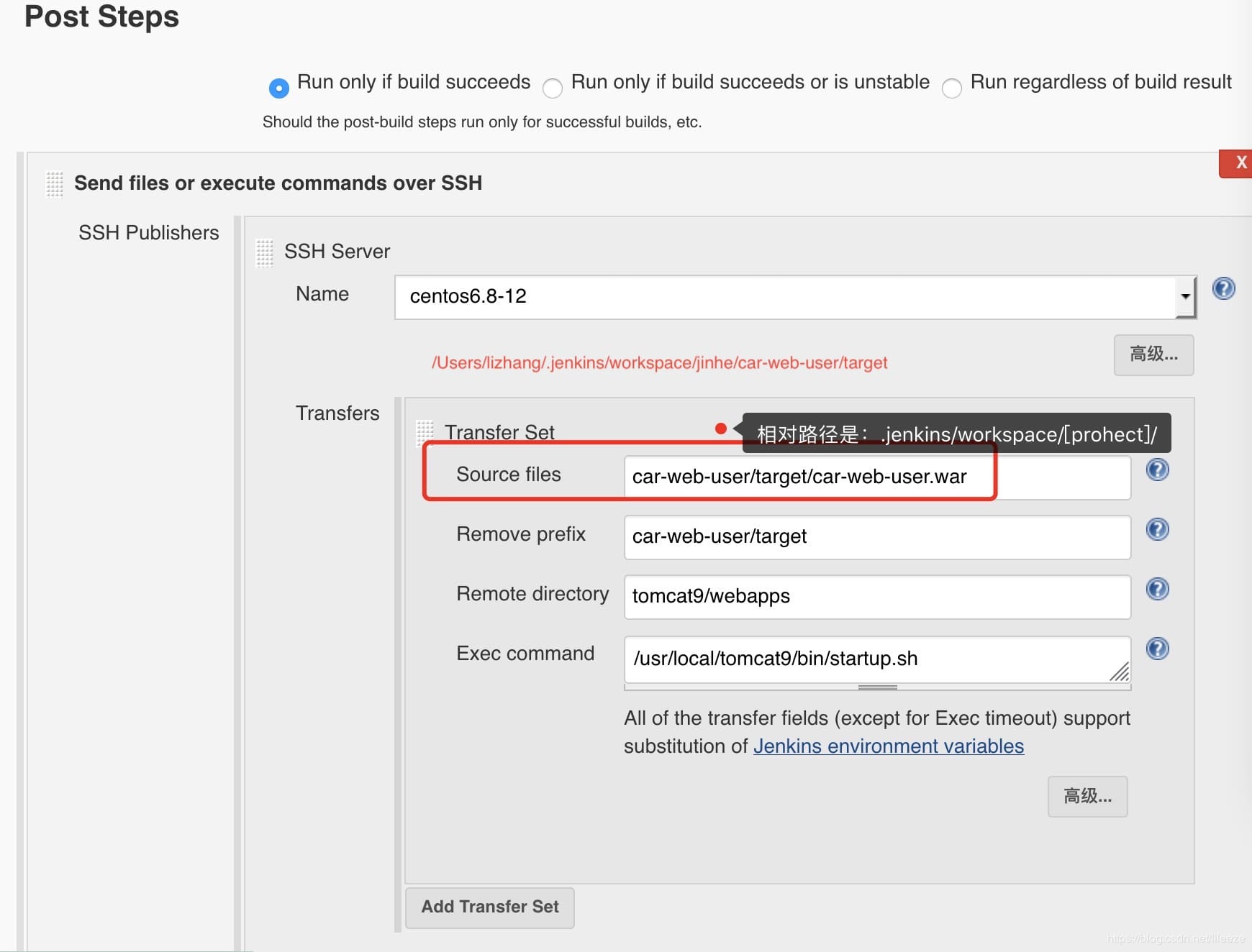 jenkins之SSH Publishers时踩的坑 发表于 2019-10-10 更新于 2020-08-24 分类于 Jenkins 阅读次数: 本文字数: 77 阅读时长 ≈ 1 分钟 source相对路径问题source相对路径问题,不是.Jenkins/workspace,而是.jenkins/workspace/[project]/